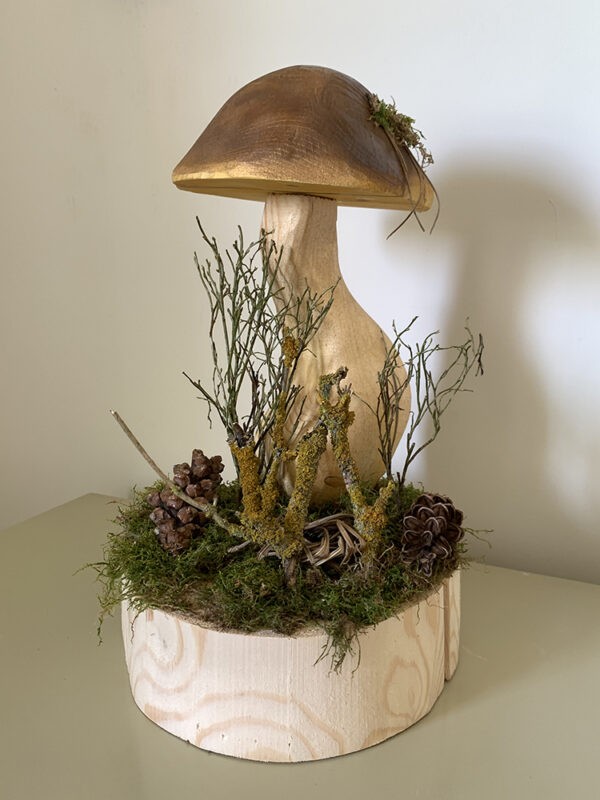 Grzybek jest malowany, osadzony na surowym grubym plastrze drewna z dodatkiem mchu, szyszek i suchych gałązek tworzących wyjątkową kompozycję łudząco przypominającą wycinek z lasu.