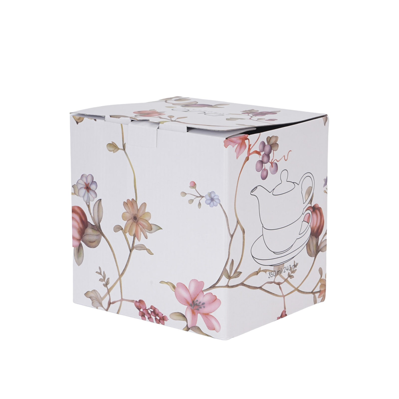 Zestaw do zaparzania herbaty lub kawy. Wykonany z porcelany New Bone China o elegancko kremowo-białawej brawie, z ozdobnym delikatnym motywem przedstawiającym różne kwiaty i pnącza.