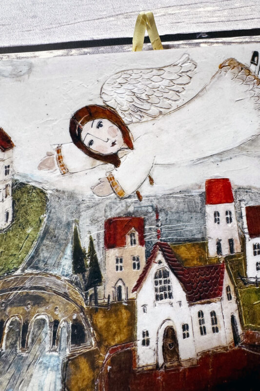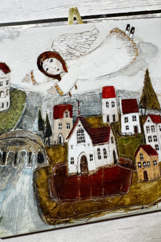 Obraz ceramiczny w postaci kafelka, przedstawia grafikę polskiej artystki, której prace charakteryzują się prostotą formy z brakiem zastosowania perspektywy. Jest to idealne połączenie dla baśniowych i ludowych motywów, które wypełniają obrazy artystki, a także dla licznie występujących elementów związanych z wiejskimi krajobrazami.