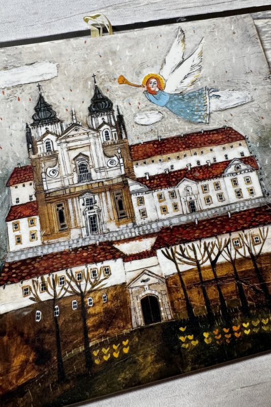 Obraz ceramiczny w postaci kafelka,  przedstawia grafikę polskiej artystki, której prace charakteryzują się prostotą formy z brakiem zastosowania perspektywy. Jest to idealne połączenie dla baśniowych i ludowych motywów, które wypełniają obrazy artystki, a także dla licznie występujących elementów związanych z wiejskimi krajobrazami.