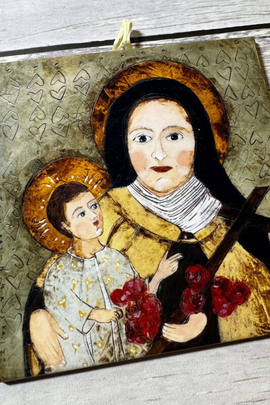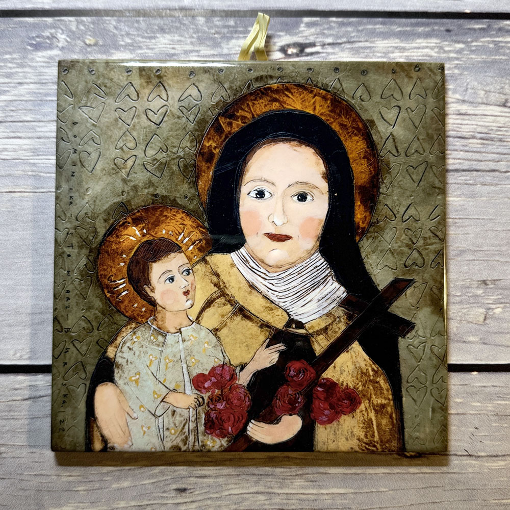 Obraz ceramiczny w postaci kafelka, przedstawia grafikę polskiej artystki, której prace charakteryzują się prostotą formy z brakiem zastosowania perspektywy. Jest to idealne połączenie dla baśniowych i ludowych motywów, które wypełniają obrazy artystki, a także dla licznie występujących elementów związanych z wiejskimi krajobrazami.