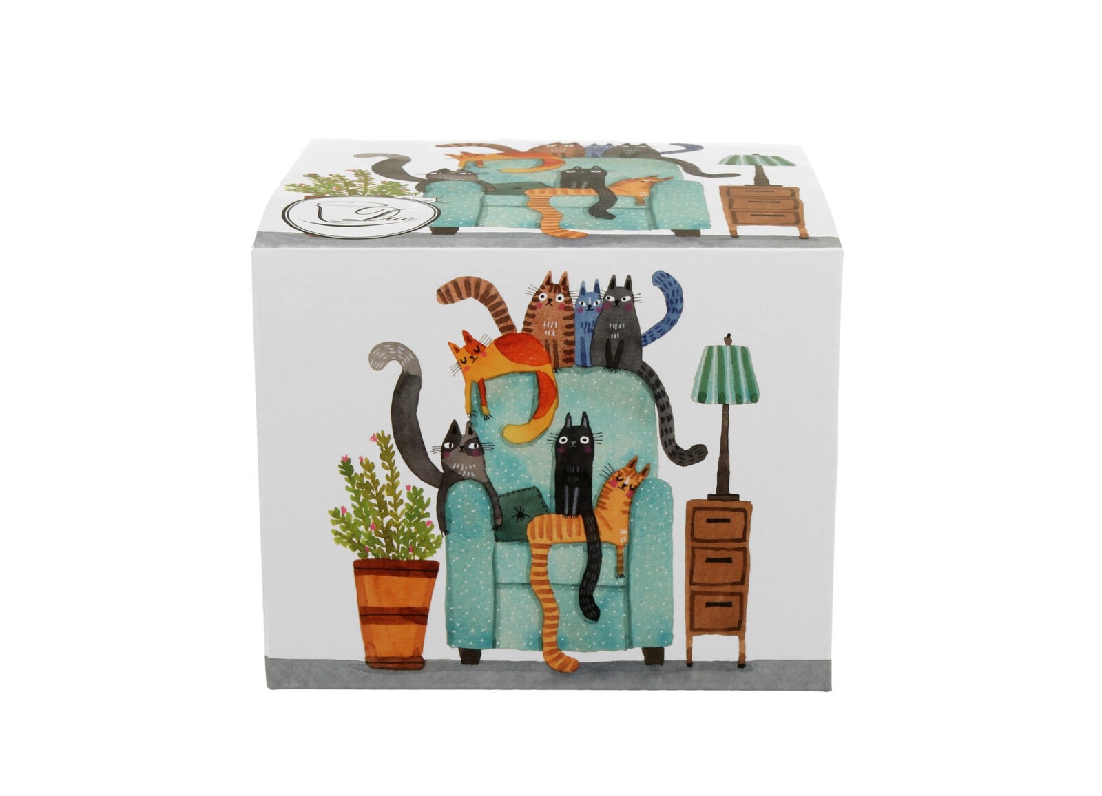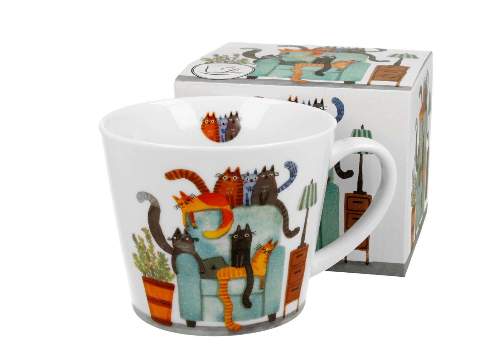 Wesoły kubek o pojemności 610 ml z domowymi kotami wypoczywającymi na fotelu . Wykonany z porcelany New Bone China o elegancko kremowo-białawej brawie.