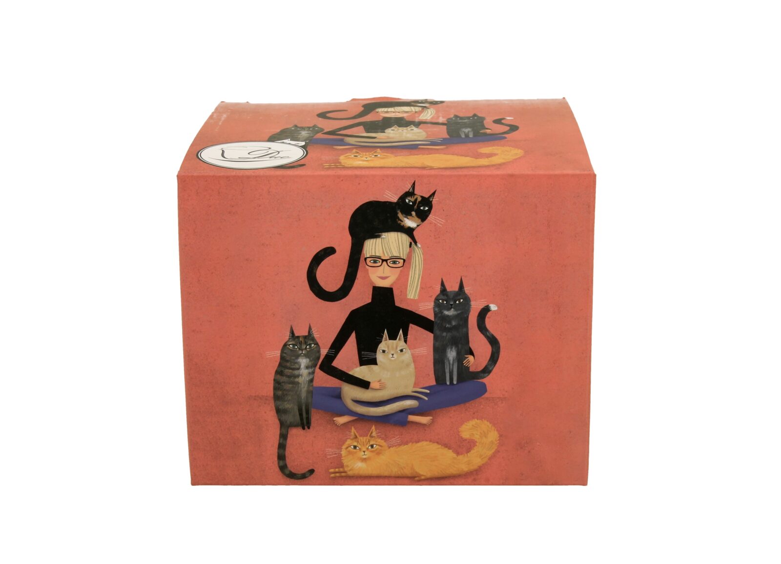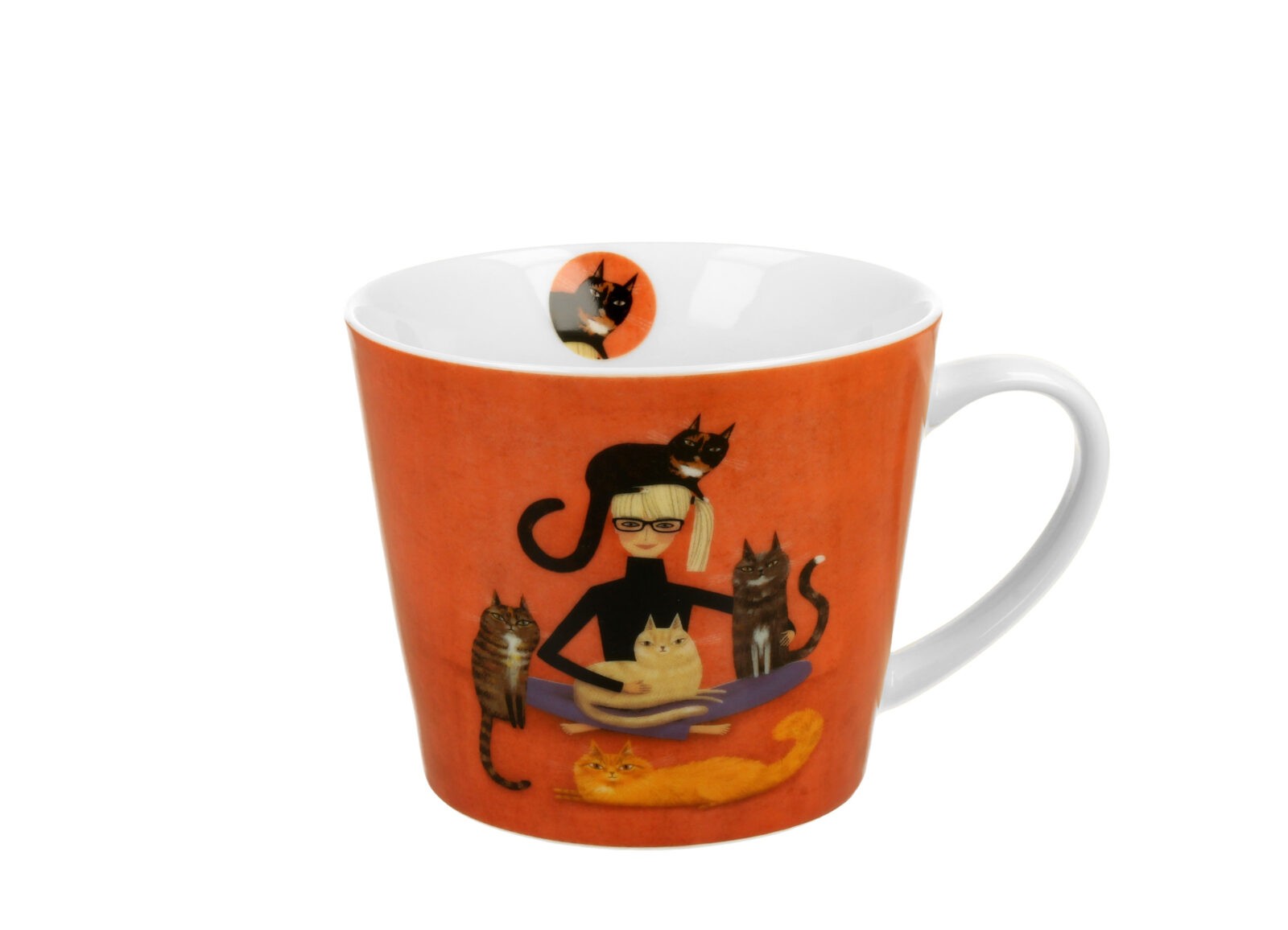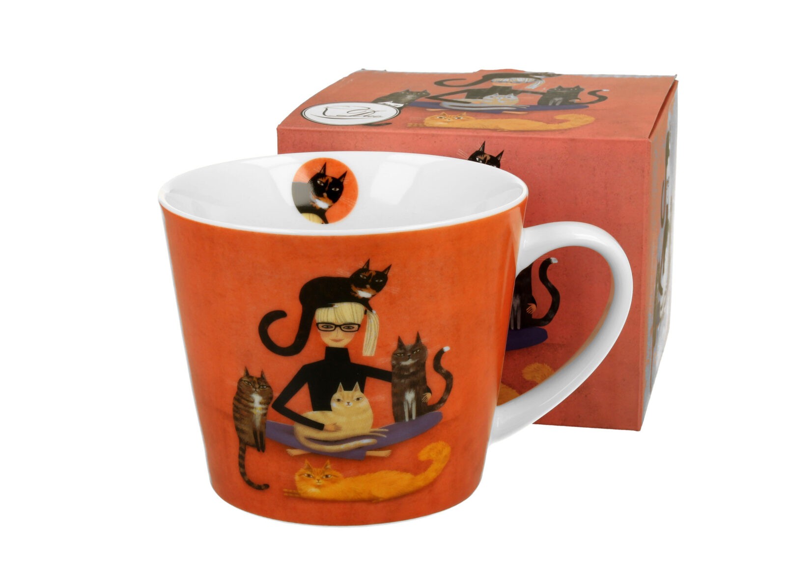Wesoły kubek o pojemności 610 ml z uroczą dziewczyną w towarzystwie kotów. Wykonany z porcelany New Bone China o elegancko kremowo-białawej brawie.