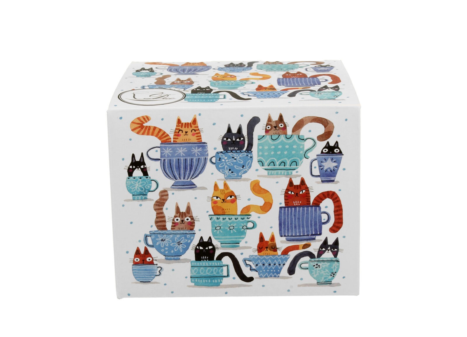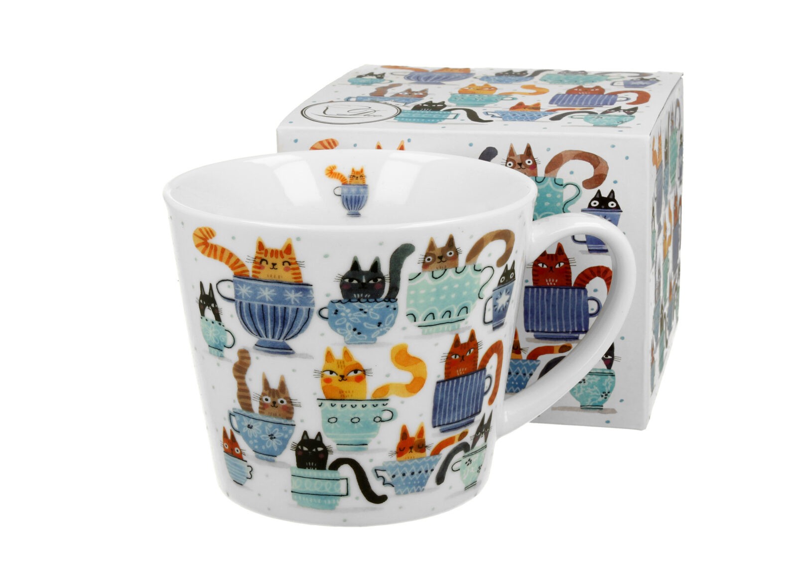 Wesoły kubek o pojemności 610 ml z domowymi kotami w ozdobnych filiżankach . Wykonany z porcelany New Bone China o elegancko kremowo-białawej brawie.