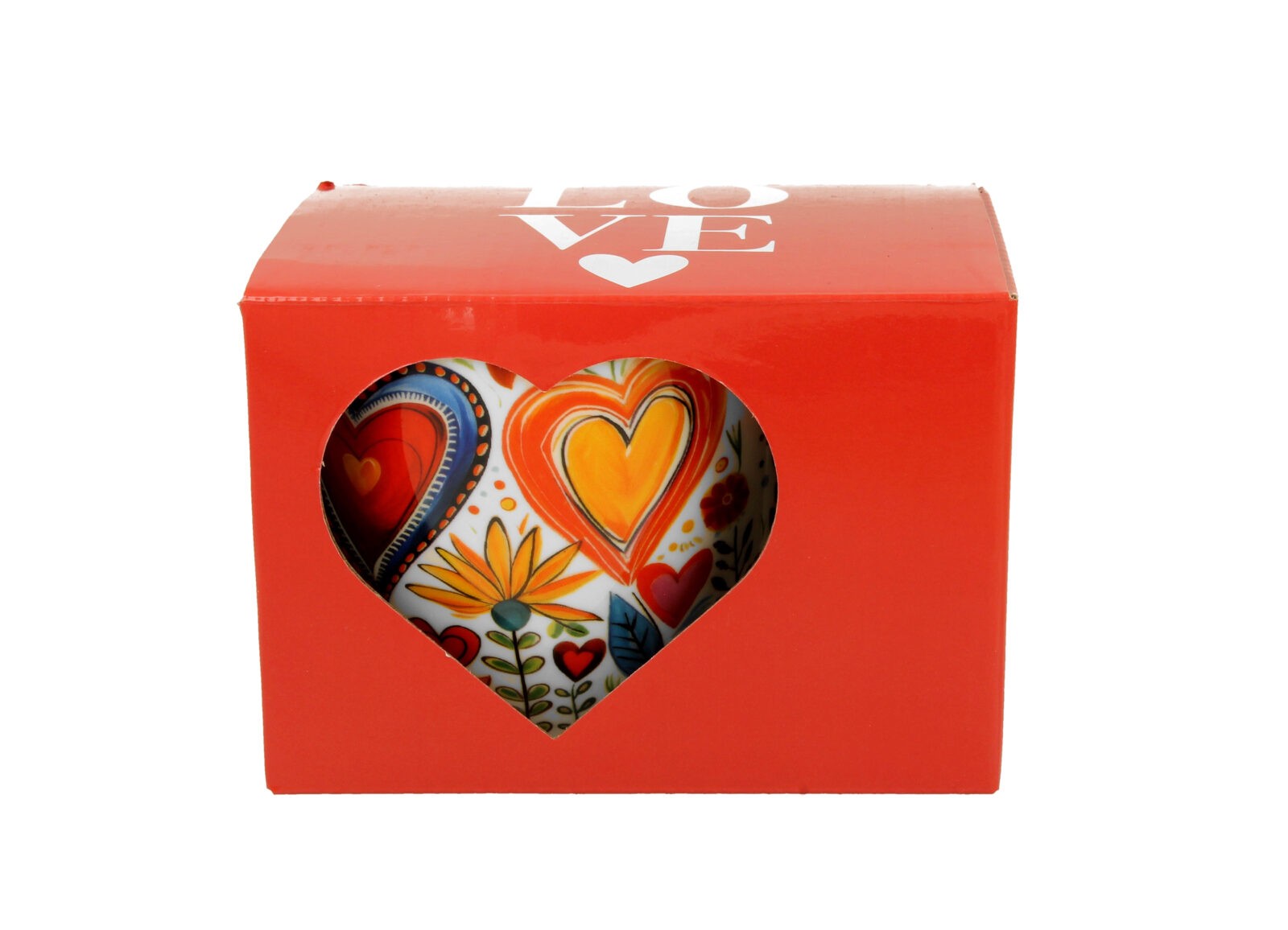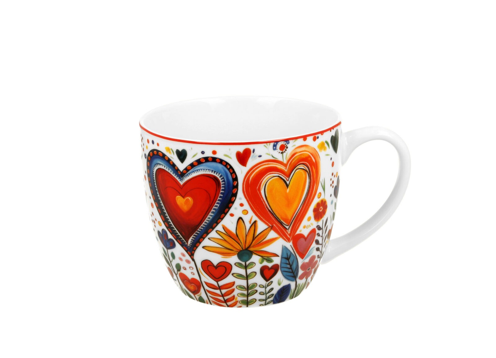 Wesoły kubek o pojemności 460 ml z kolorowymi serduszkami oraz kwiatami w folkowym klimacie.