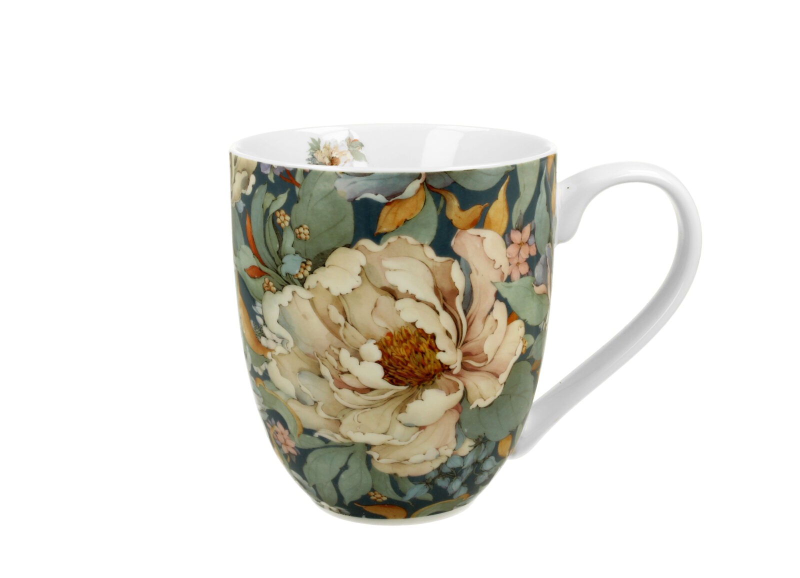 Duży i wygodny kubek o pojemności 1 litra. Wykonany z porcelany New Bone China o elegancko kremowo-białawej barwie, z kwiecistym motywem kwitnących peoni.