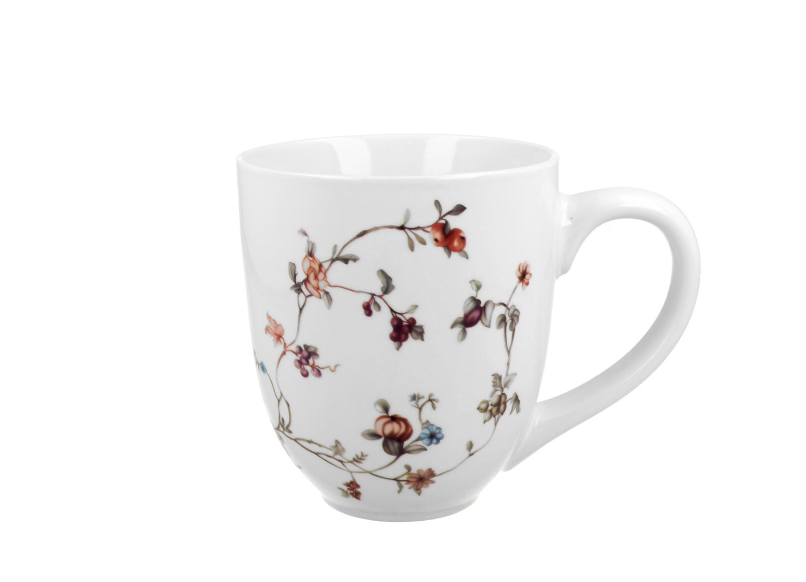 Duży i wygodny kubek o pojemności 1 litra. Wykonany z porcelany New Bone China o elegancko kremowo-białawej brawie, z ozdobnym motywem delikatnych kwiecistych pnączy w pastelowych kolorach.