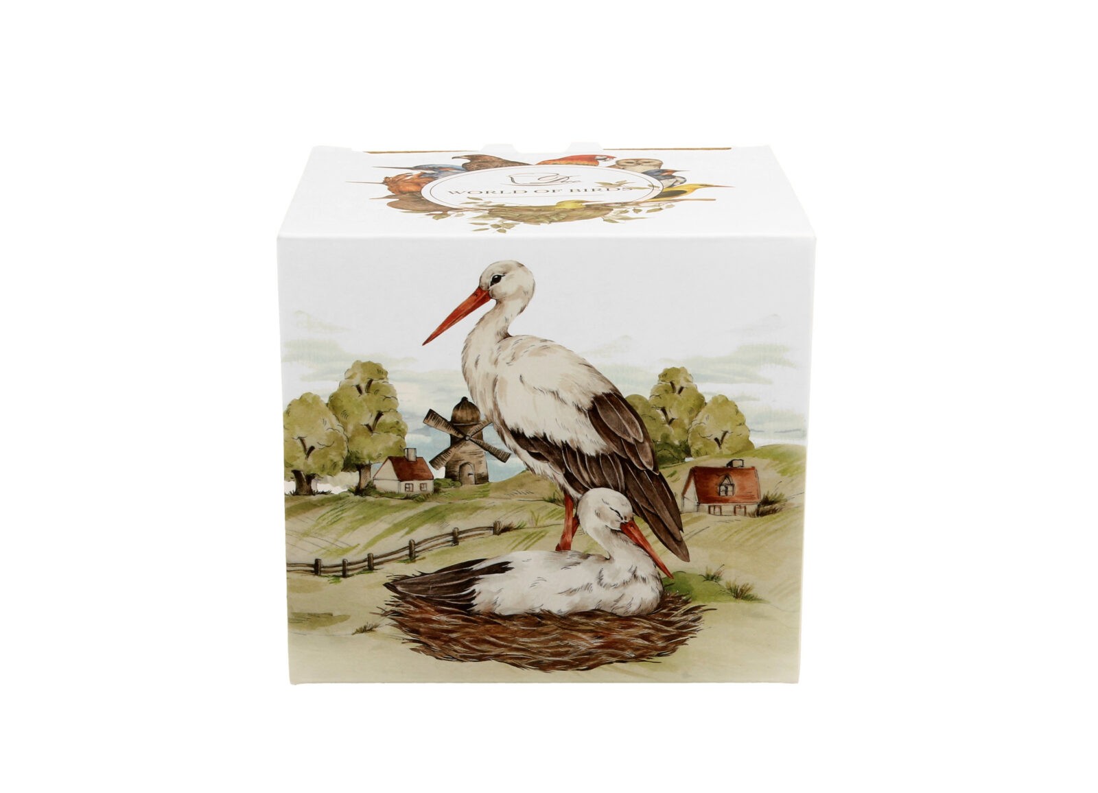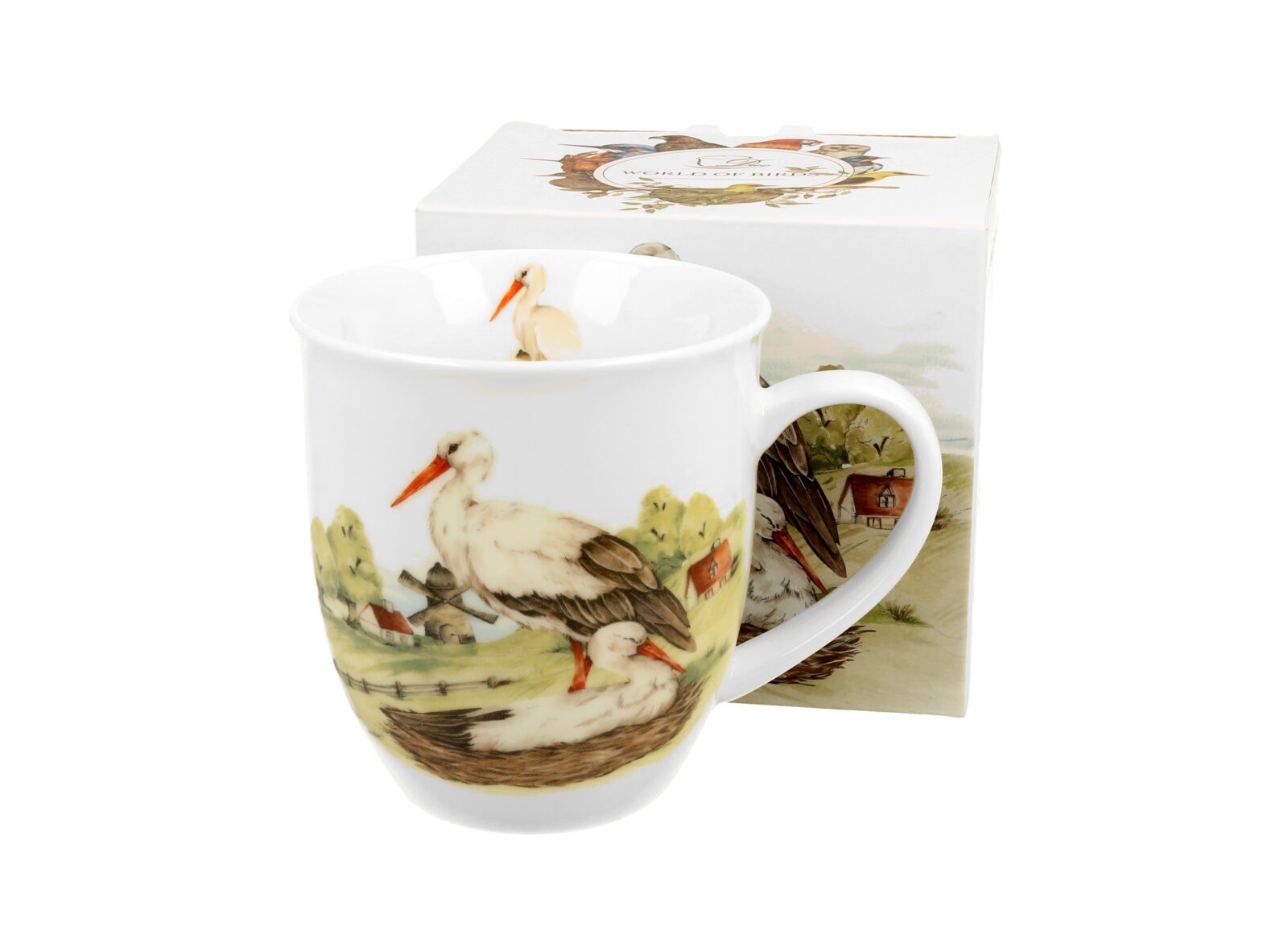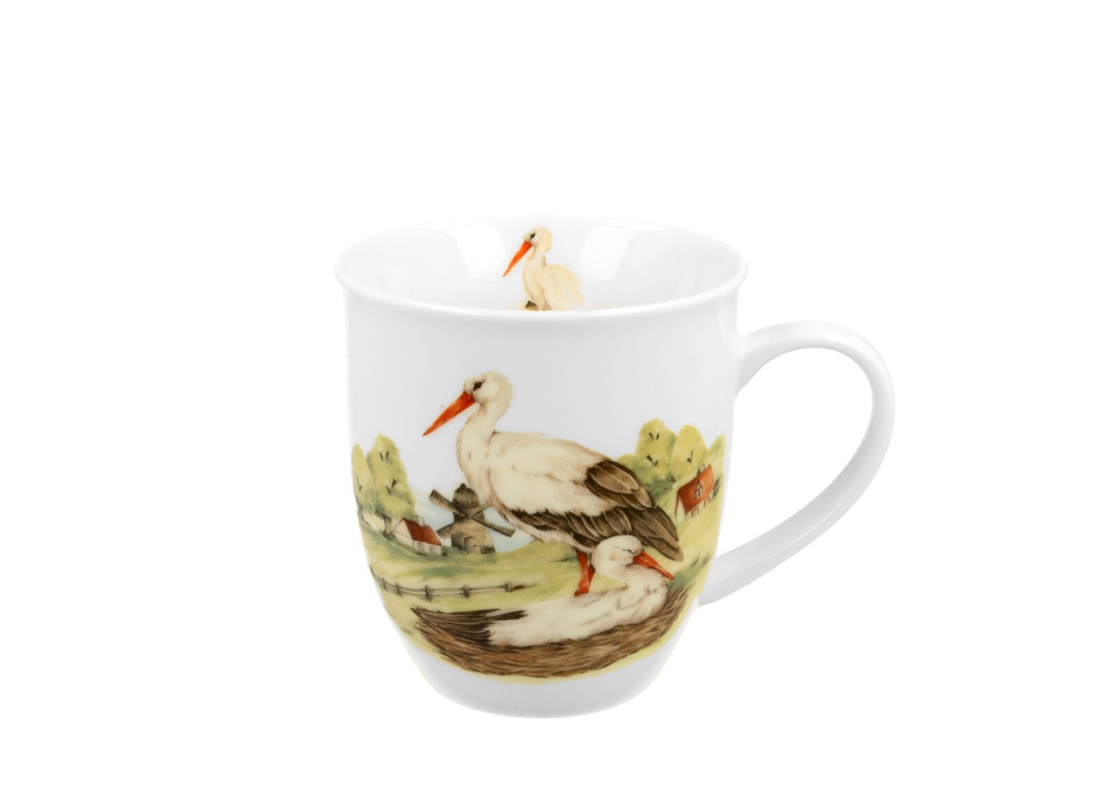 Kubek o pojemności 400 ml z bocianem w gnieździe. Wykonany z porcelany New Bone China o elegancko kremowo-białawej brawie.