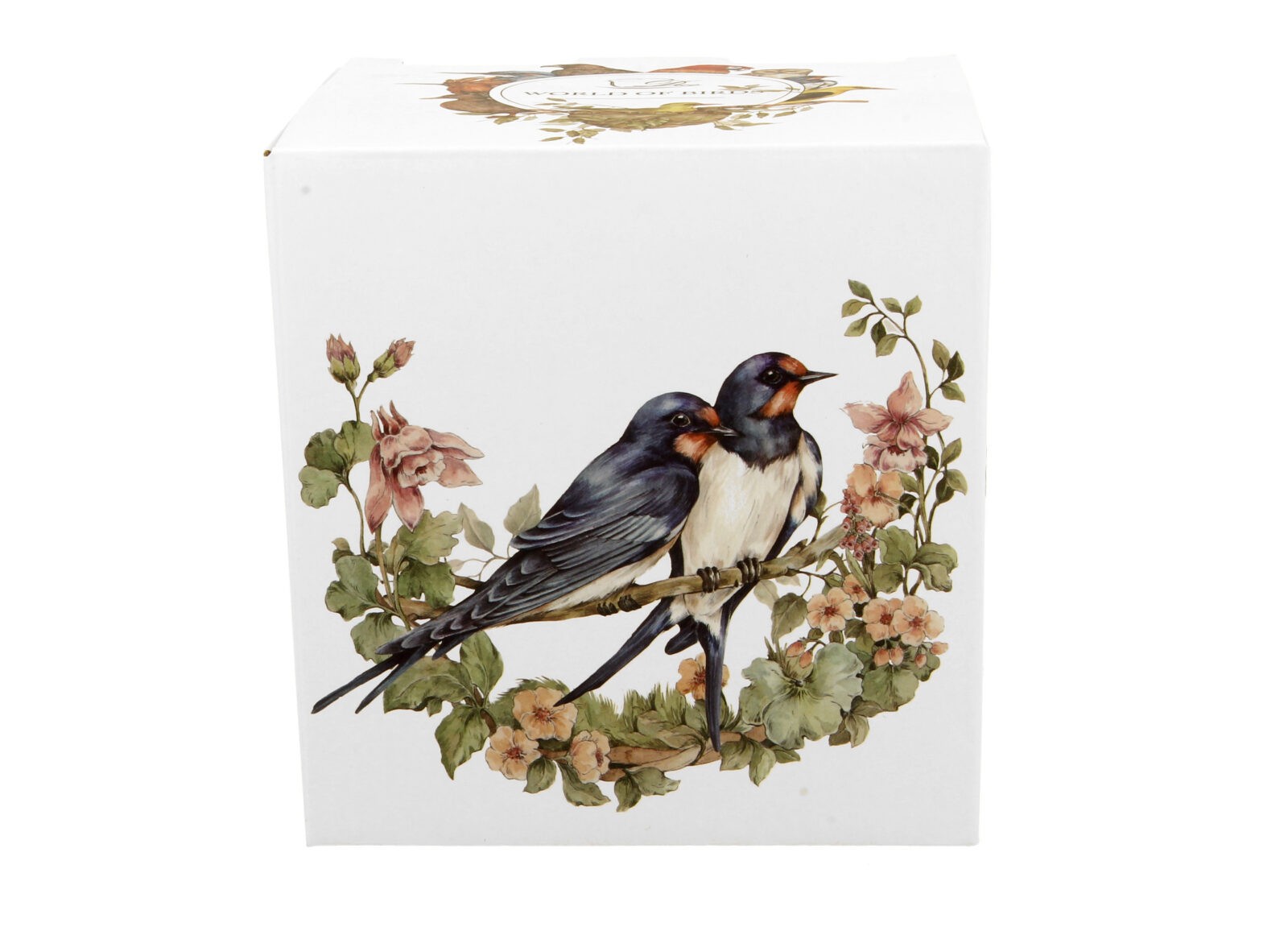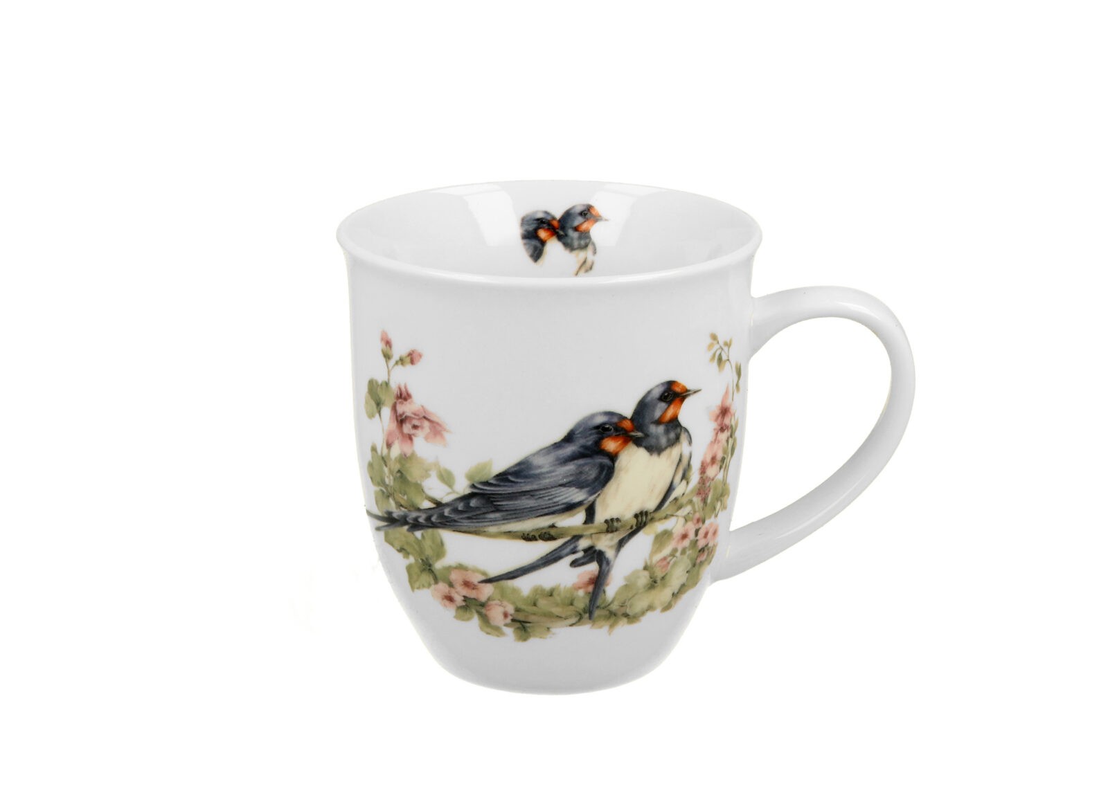 Kubek o pojemności 400 ml z ptaszkami (jaskółki). Wykonany z porcelany New Bone China o elegancko kremowo-białawej brawie.