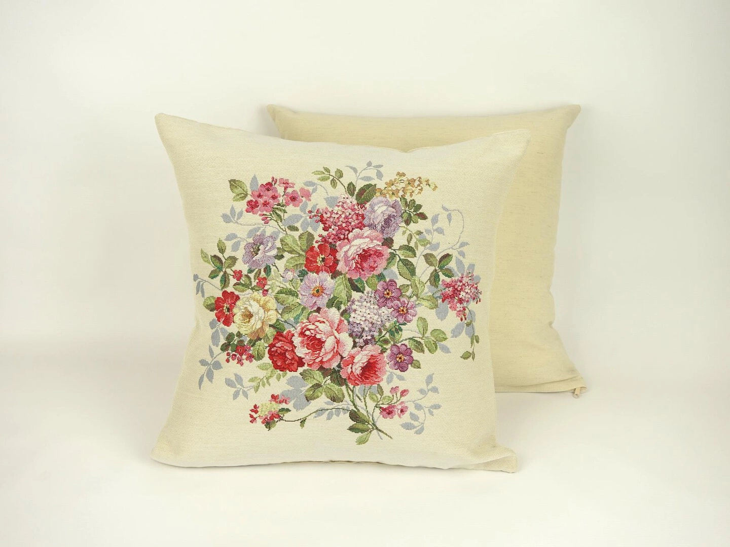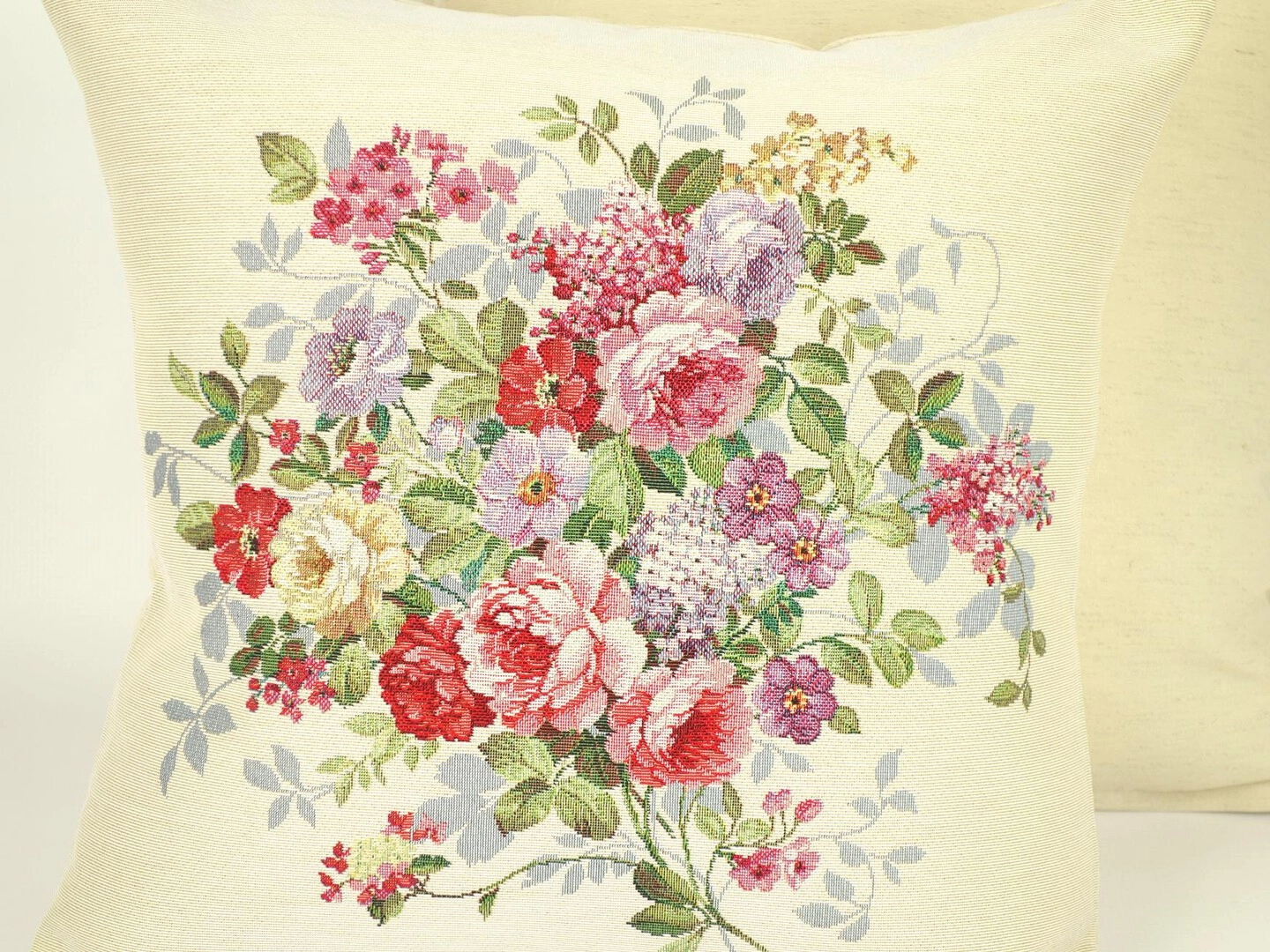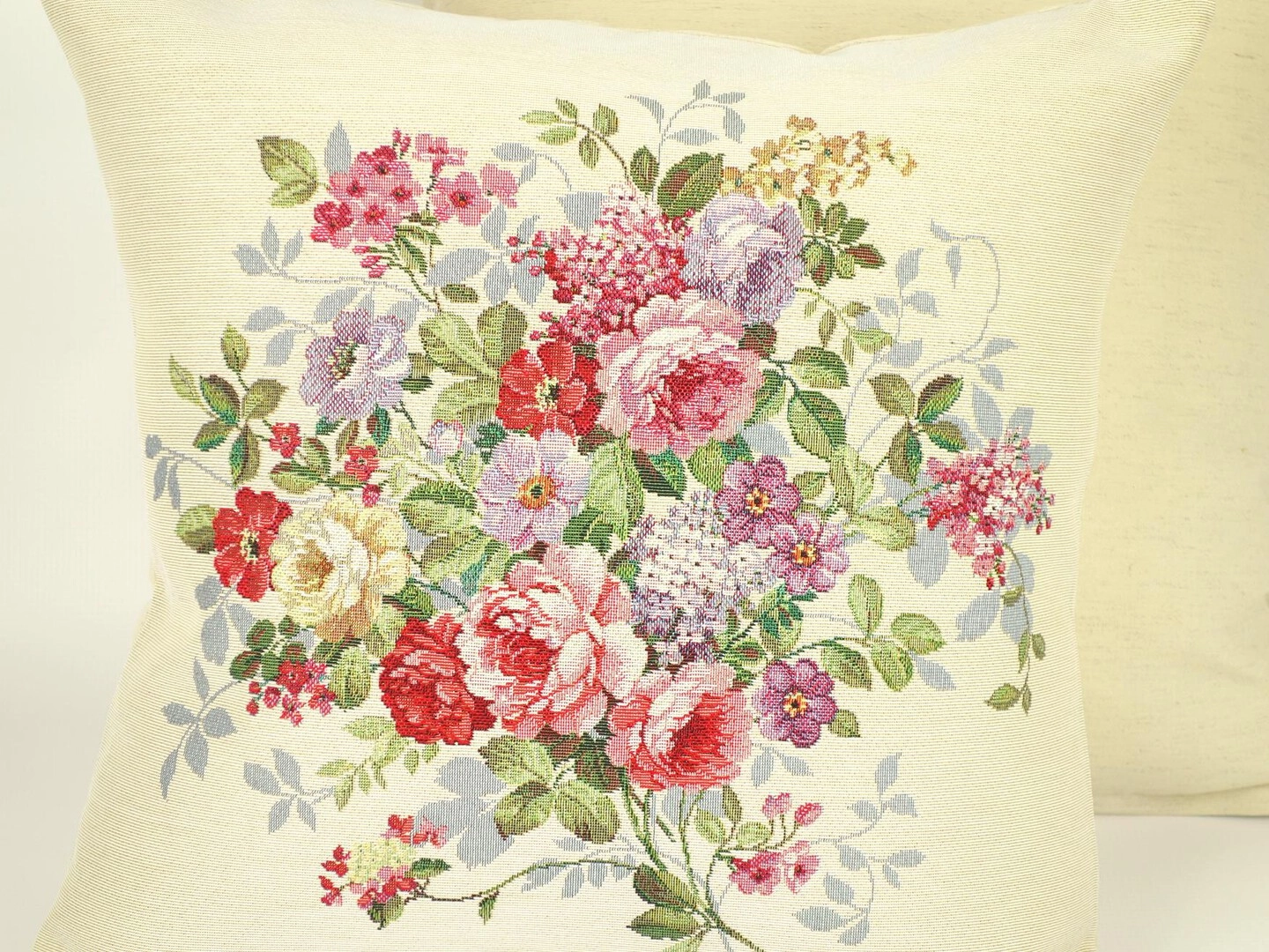 Ozdobna poszewka z tkaniny gobelinowej z pięknym tkanym wzorem w postaci bukietu kwiatów. Świetna jako dekoracja domu oraz pomysł na prezent.