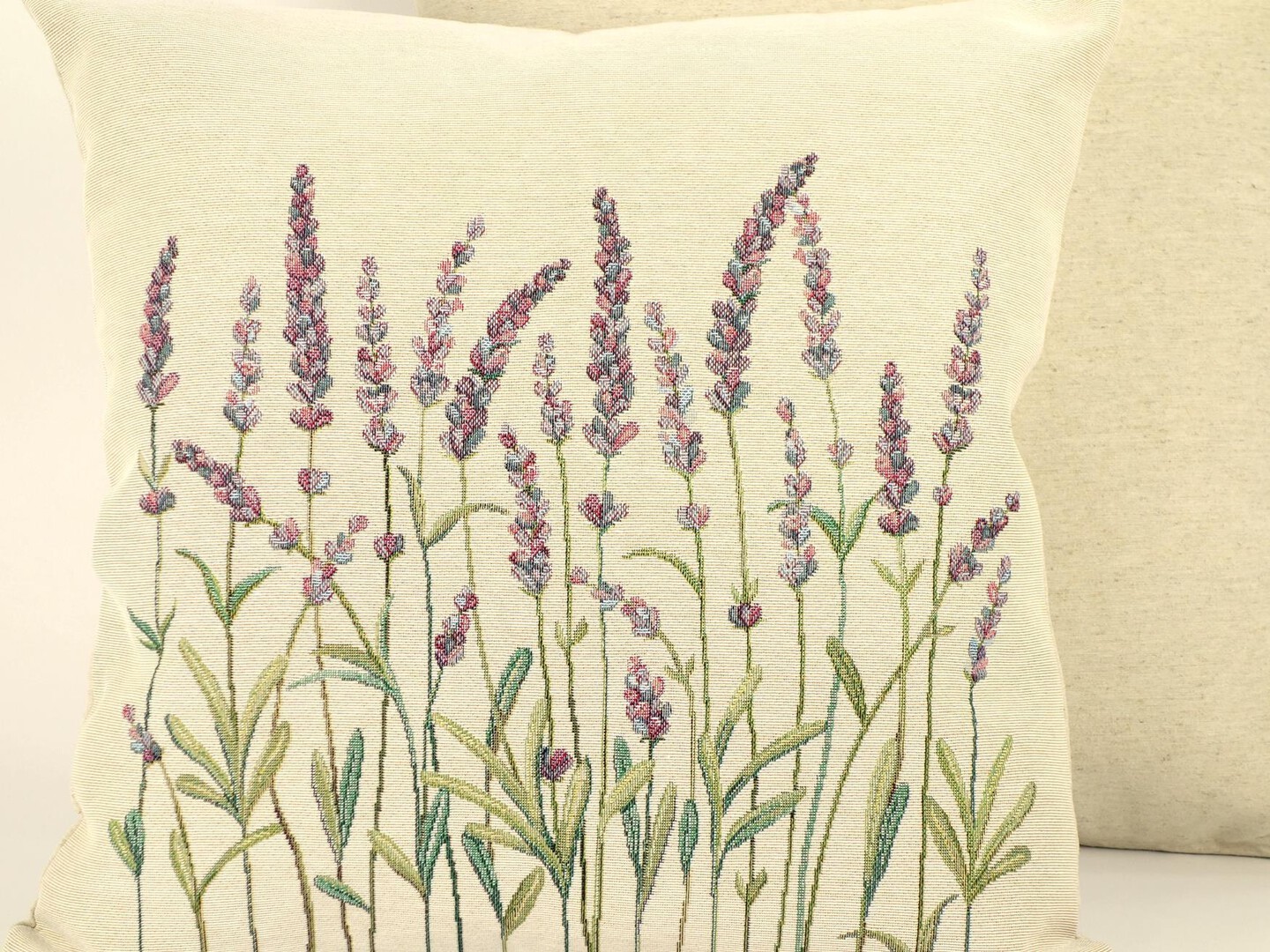 Ozdobna poszewka z tkaniny gobelinowej z pięknym tkanym wzorem w postaci lawendy. Świetna jako dekoracja domu oraz pomysł na prezent.