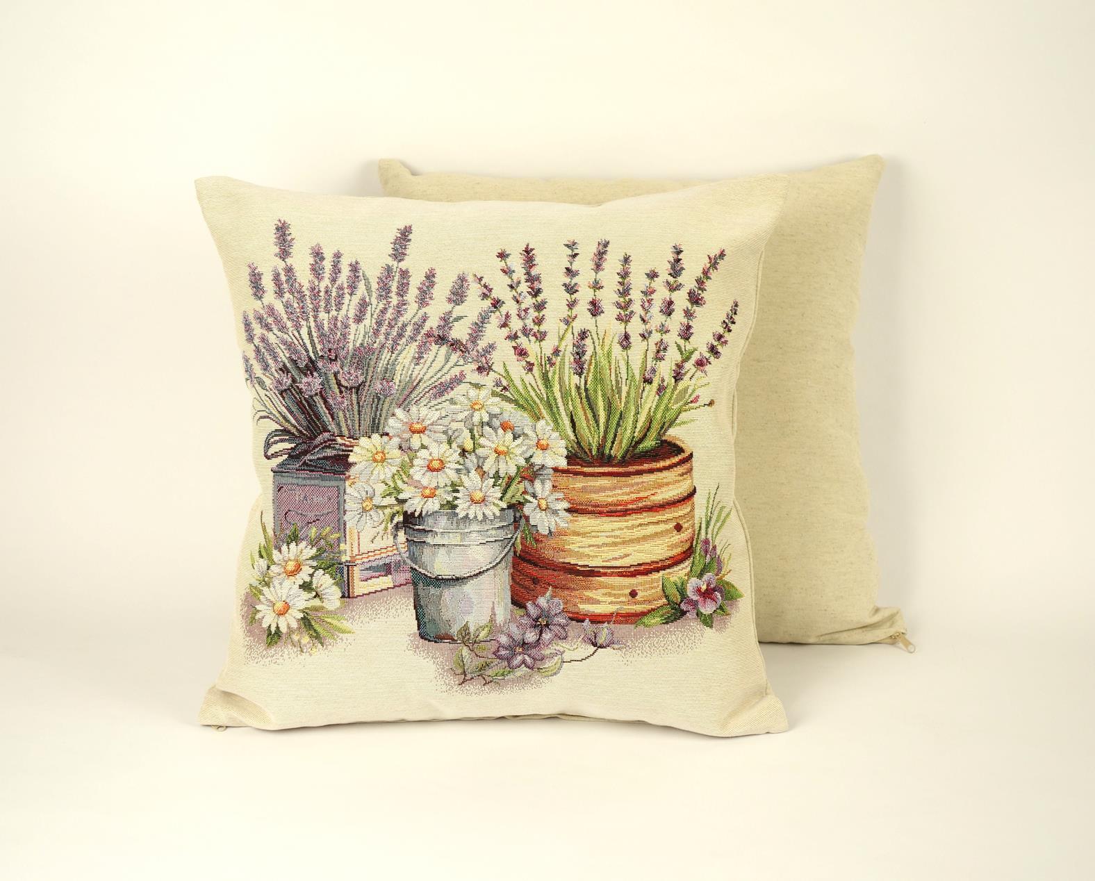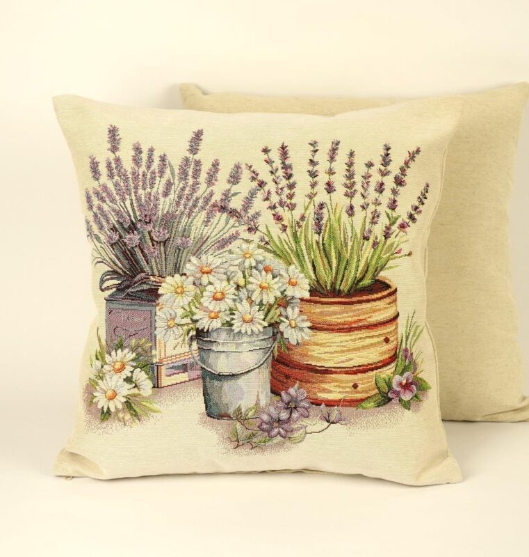 Ozdobna poszewka z tkaniny gobelinowej z pięknym tkanym wzorem w postaci lawendy i stokrotek . Świetna jako dekoracja domu oraz pomysł na prezent.