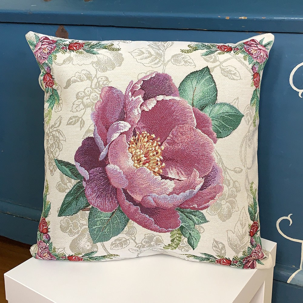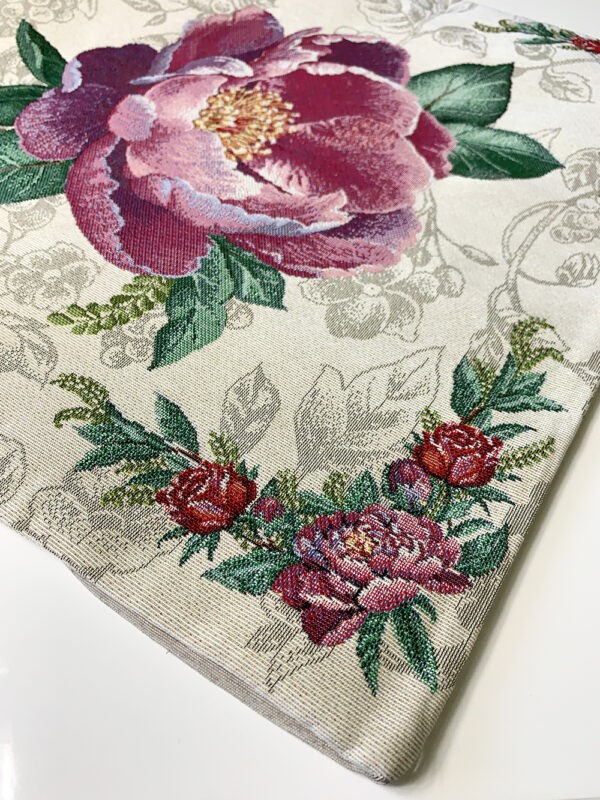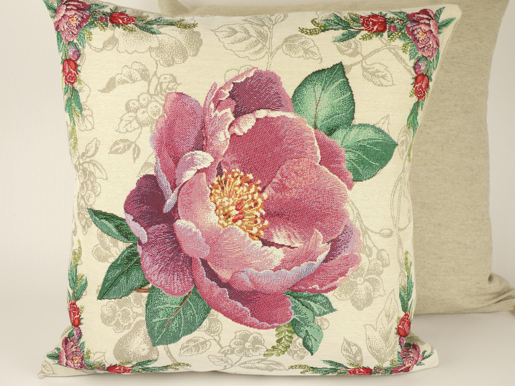 Ozdobna poszewka z tkaniny gobelinowej z pięknym tkanym wzorem w postaci róży. Świetna jako dekoracja domu oraz pomysł na prezent.